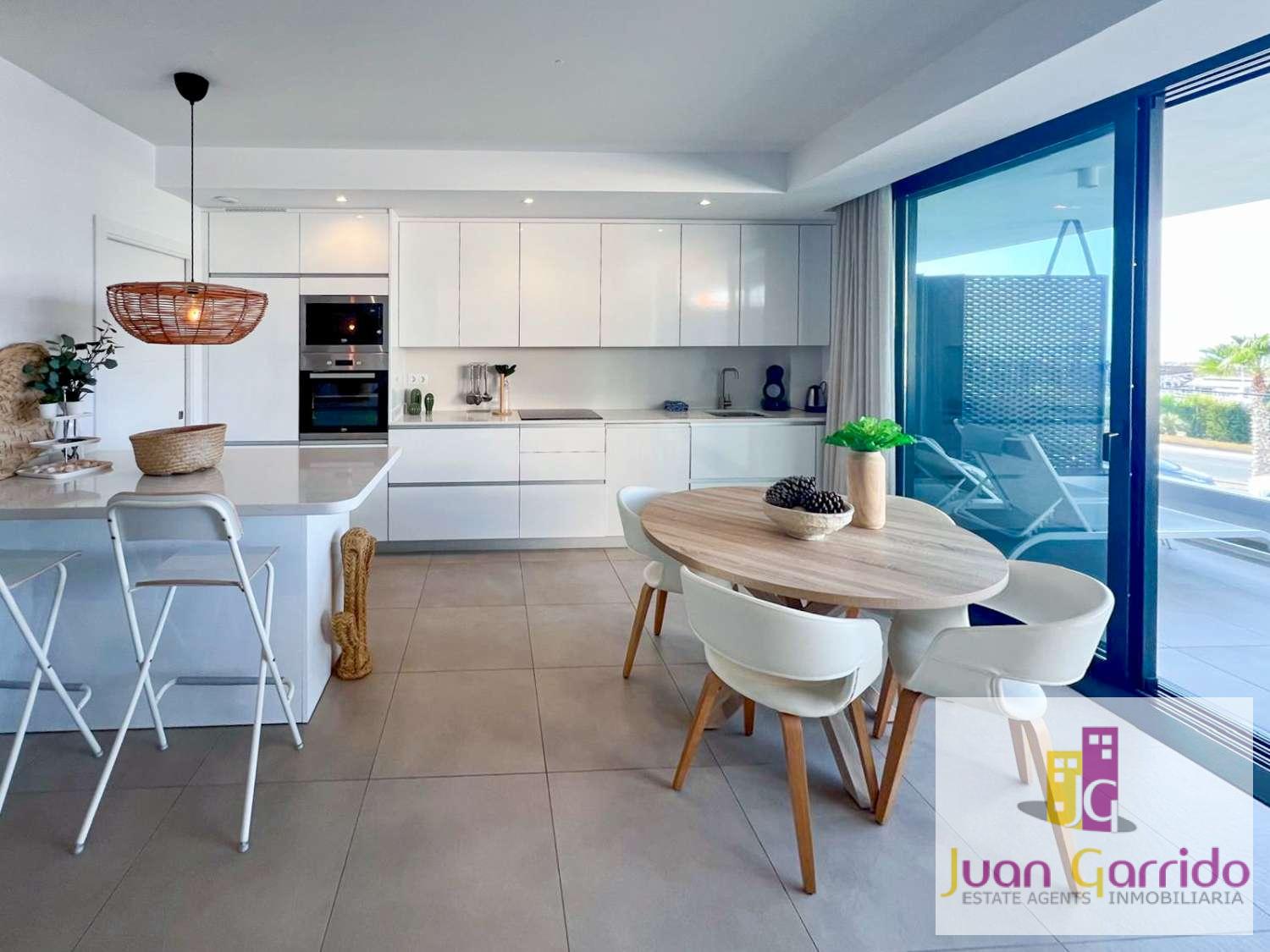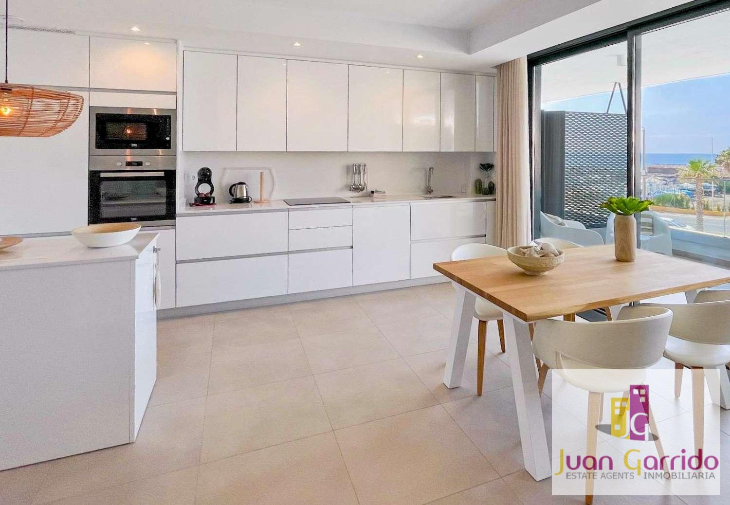 The interior features a spacious layout with a bright living room and a fully fitted kitchen, both of which open onto a generous terrace—perfect for soaking in panoramic Mediterranean views while dining al fresco or lounging in the sun. The master bedroom boasts a double bed, built-in wardrobe, and en-suite bathroom, while the second bedroom offers twin beds and ample storage. Both bathrooms feature sleek walk-in showers. With step-free entry, an elevator, and underground parking complete with private storage.