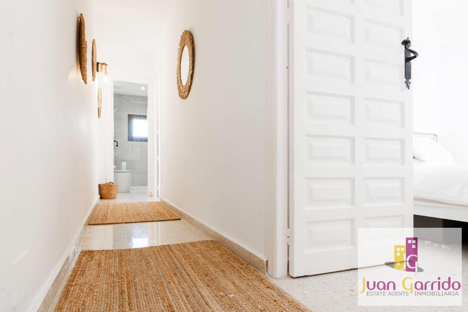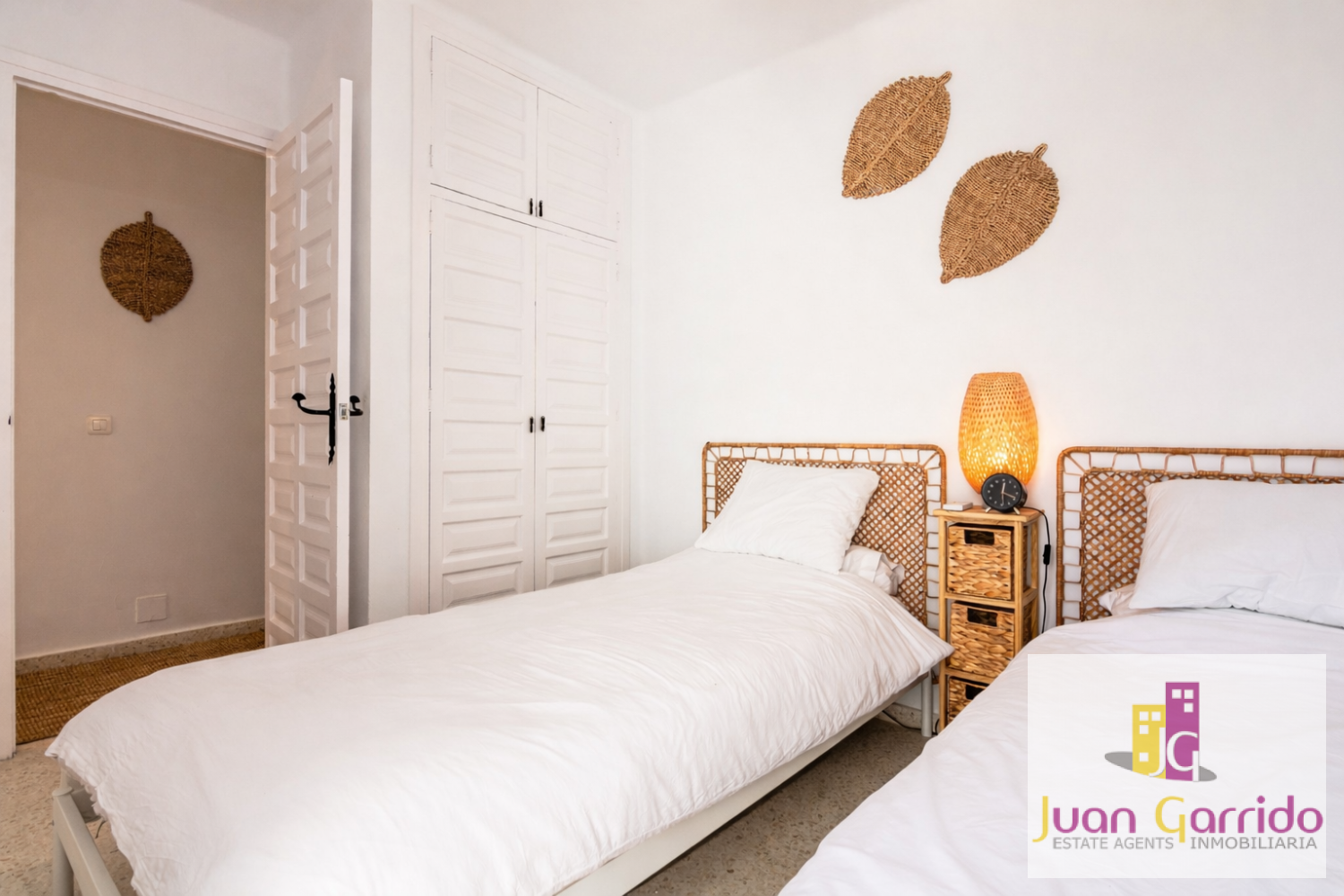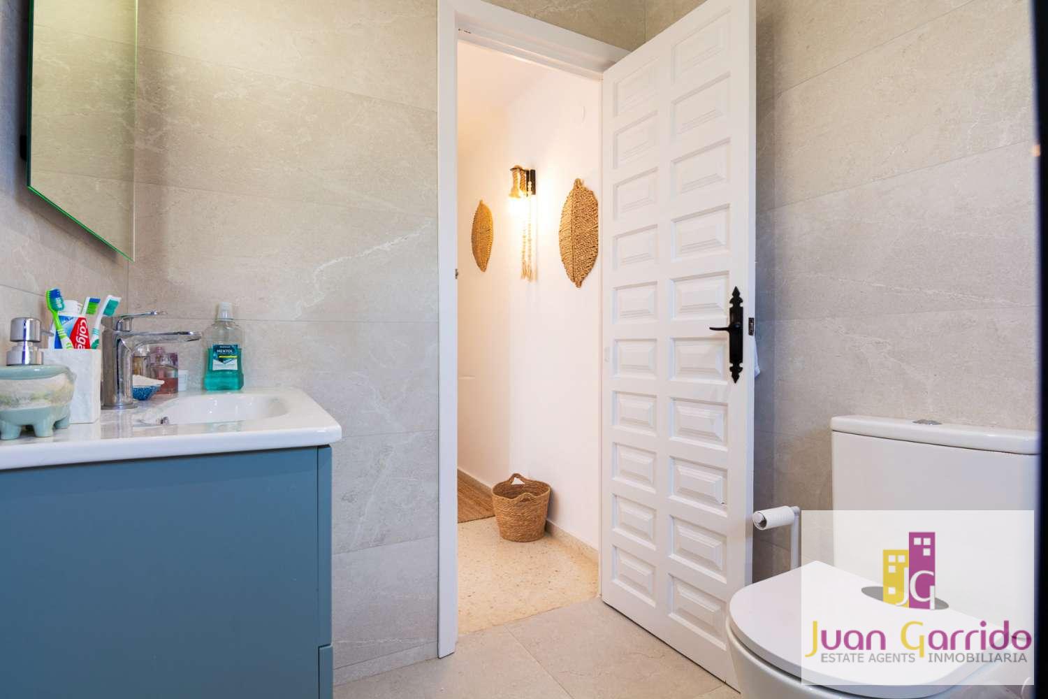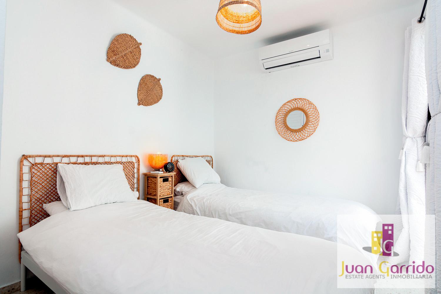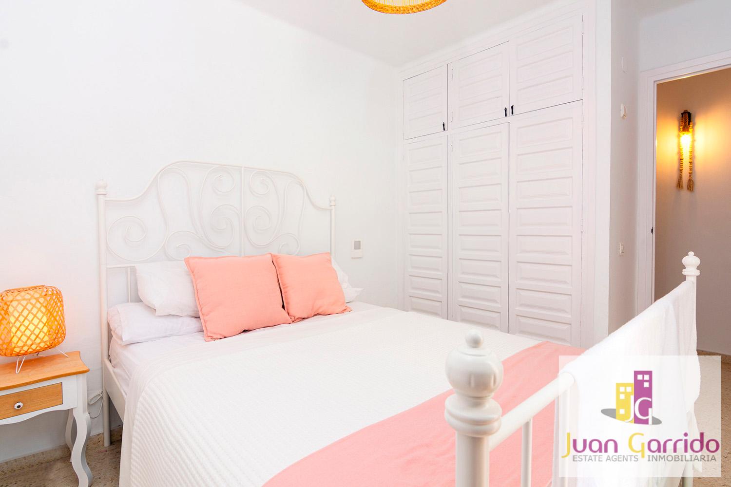 Upstairs, the property comprises a refurbished family bathroom and two spacious double bedrooms, both with fitted wardrobes and access to private terraces overlooking the beautifully landscaped gardens of the urbanisation.