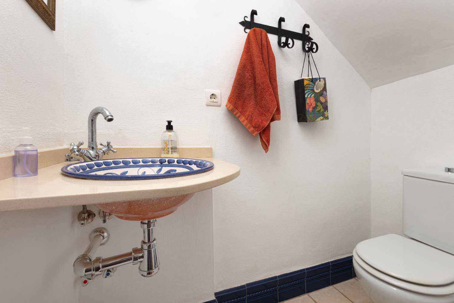 Upstairs offers a full bathroom and two generous bedrooms; the master bedroom enjoys direct access to two terraces, one with stunning sea views.
