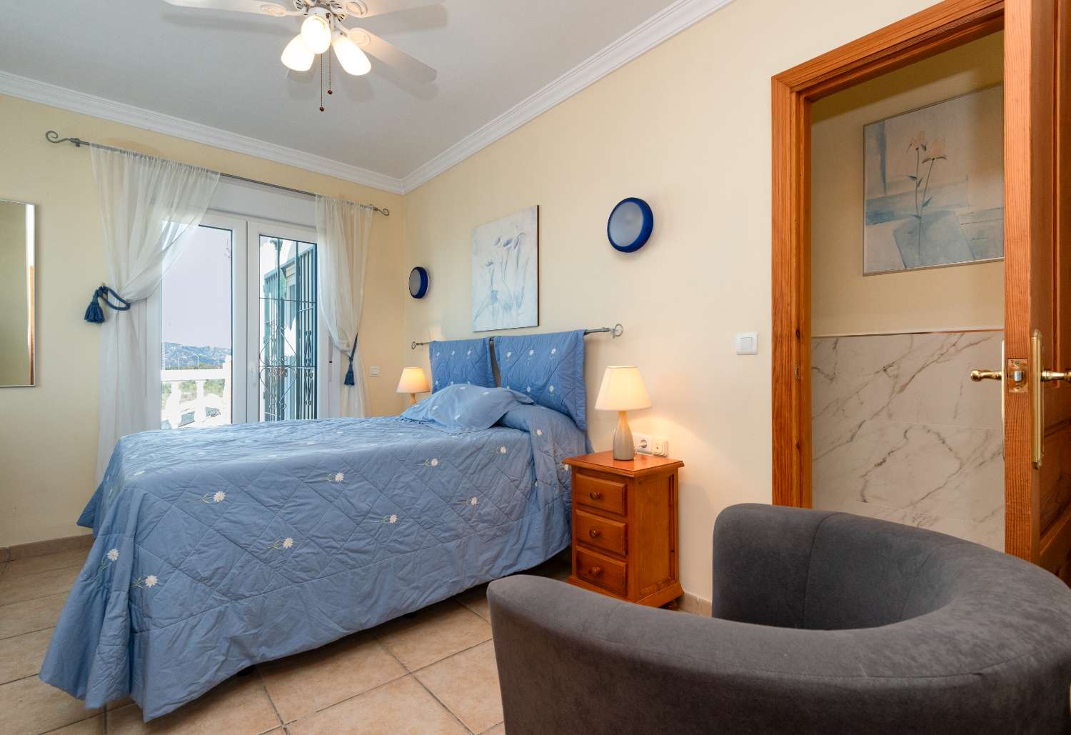 Upstairs, you'll find three bright double bedrooms, all with fitted wardrobes, en suite bathrooms, and access to sunny terraces. The master suite stands out for its particularly spacious layout and beautiful sea views.