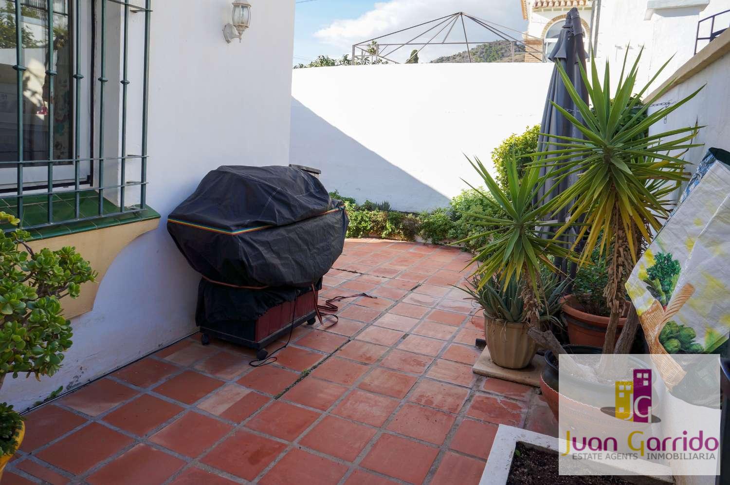 A short flight of stairs leads to two generous double bedrooms and two bathrooms, one of which is en suite. A further half flight takes you to the third bedroom, currently used as an office, which benefits from its own private terrace boasting views over the pool, the sea, and towards Nerja.