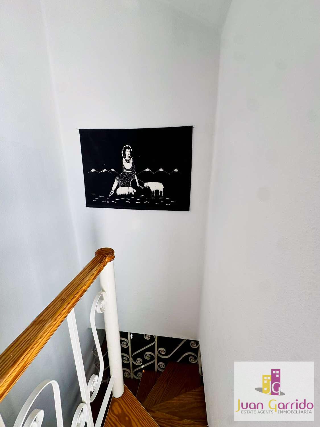 Una elegante escalera de caracol conduce a la planta superior, donde se encuentran dos dormitorios adicionales, otro baño completo y una salita de estar. Desde este nivel se accede a una segunda terraza que ofrece un agradable espacio exterior adicional para disfrutar del clima mediterráneo.